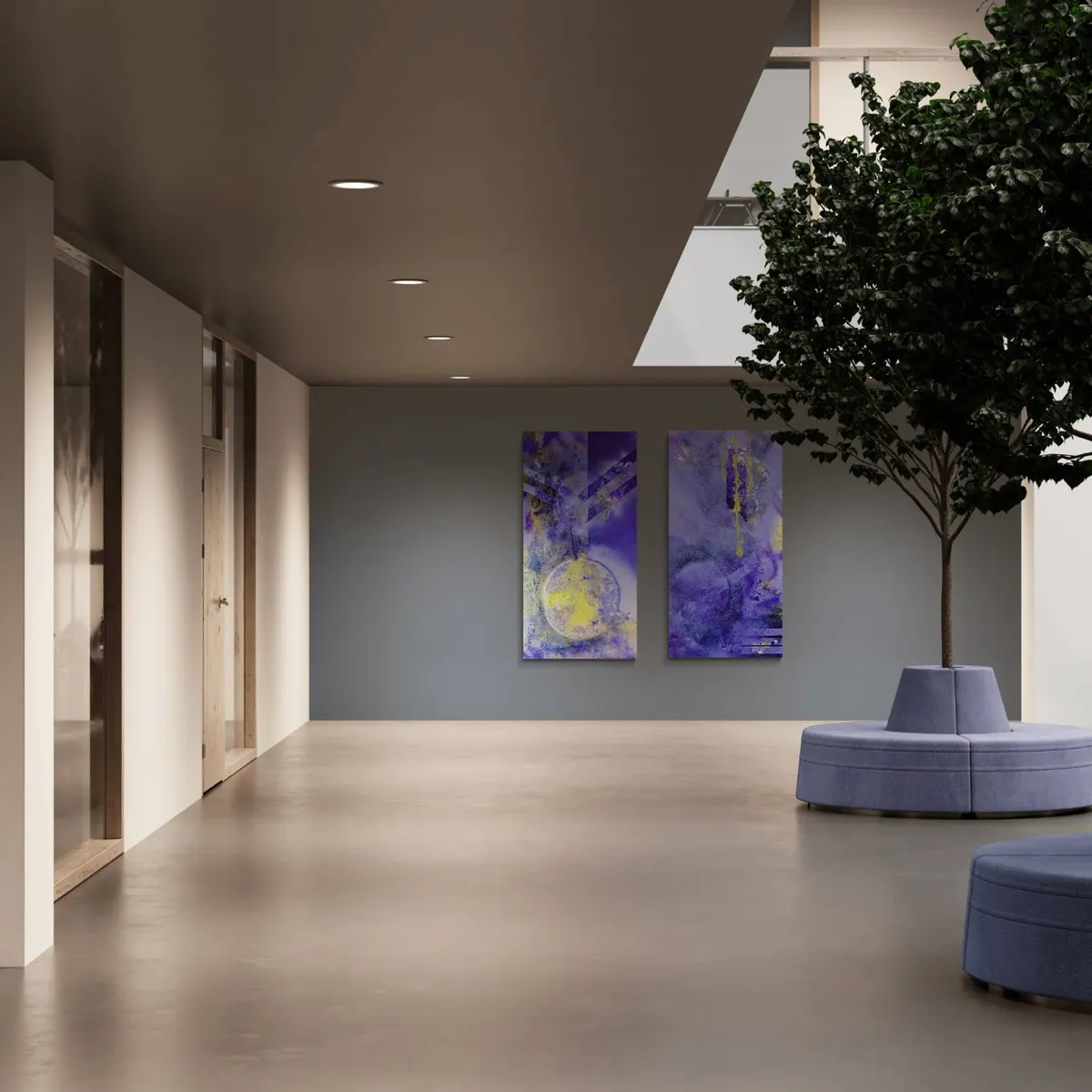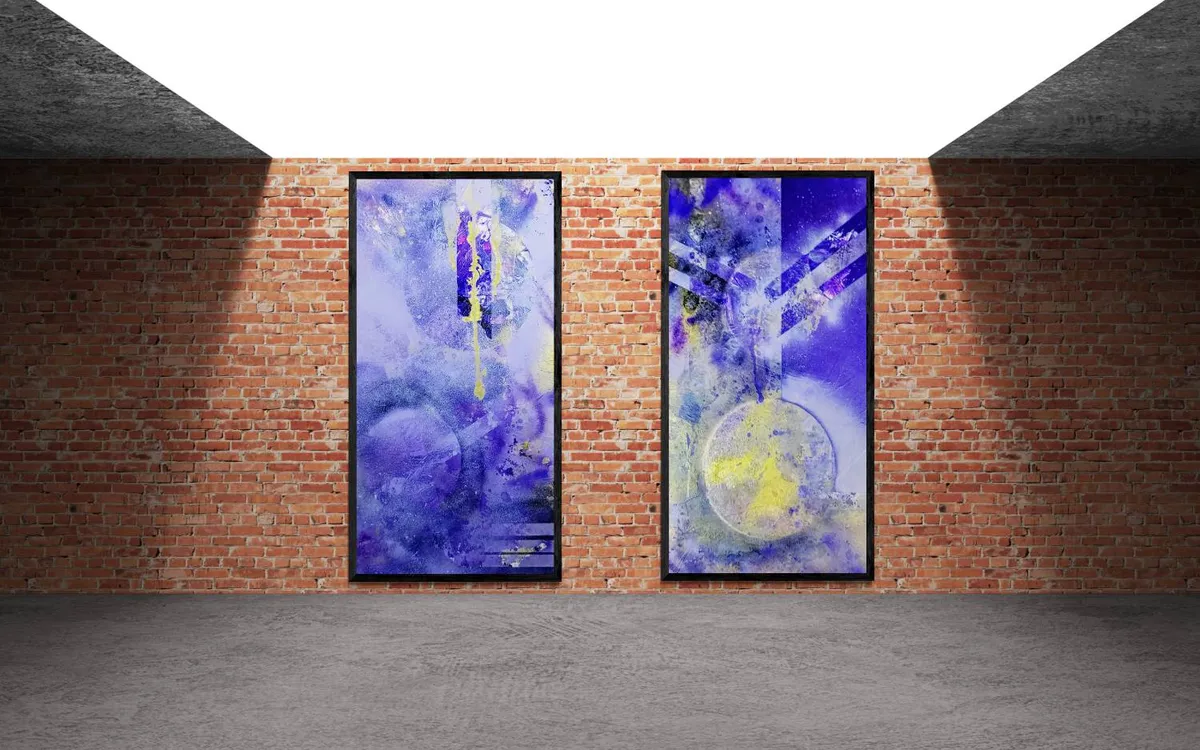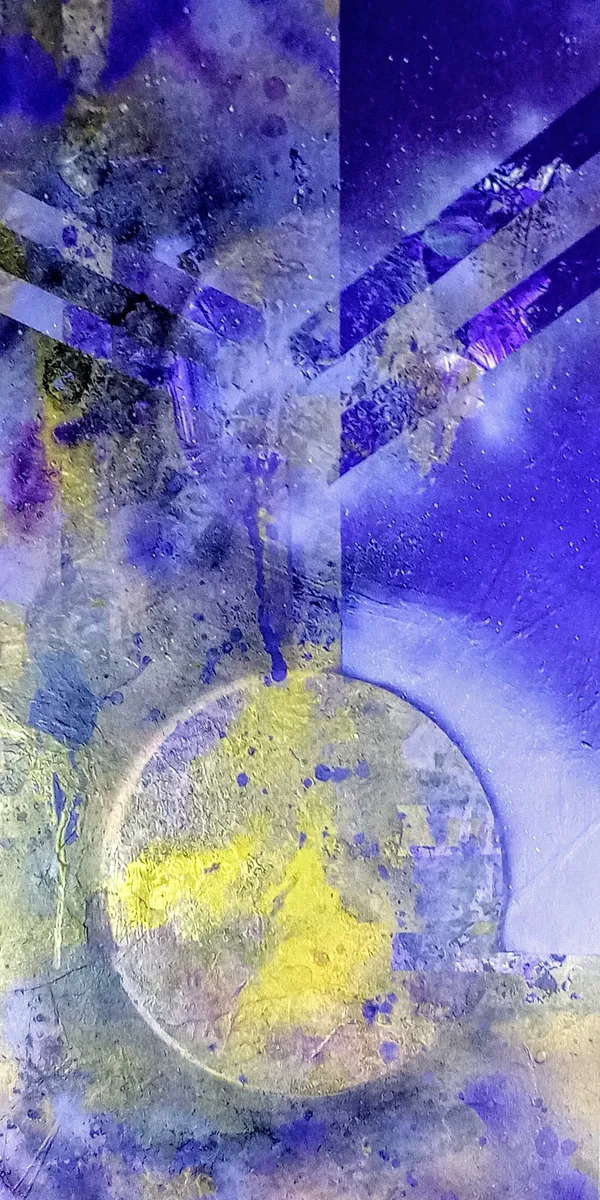 Evoking a sense of cosmic harmony through two gold-toned circles accented with pink and purple gradients. Partially obscured by textured chevron lines, the forms suggest planetary bodies in motion, layered within a dreamlike atmosphere. This piece invites reflection on balance, obscurity, and the quiet rhythm of the universe.