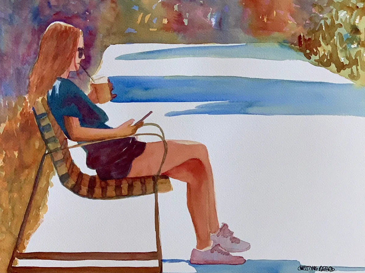 Thoughtful Sips By Christine Beard 2024 Watercolour On Paper 41 cm W x 31 cm H.jpg